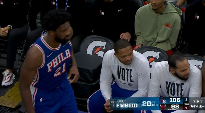 此时基迪开始带队反击,各种突破上篮,冲抢前场篮板,公牛就两分两分得也不投三分,因为你不进球,我只要得两分,我就可以缩小分差。大帝恩比德留着体力到最后时刻,上来就是哐哐3个打铁,各种犯罪一个不中。